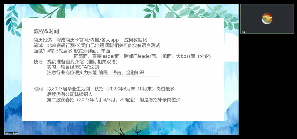 4月7日晚,米兰milan官方网站学业与职业支持中心举办“就业经验分享沙龙”系列活动之实习就业专场。本次分享会邀请已获得快手、阿里、顺丰、京东、比亚迪等大厂录用通知的钱真同学,就职于字节跳动的黄皙雲同学,为大家讲解求职的面试流程、注意事项、简历撰写等问题,为有相关求职意向的学生提供借鉴经验,帮助其调整优化自身发展计划。
