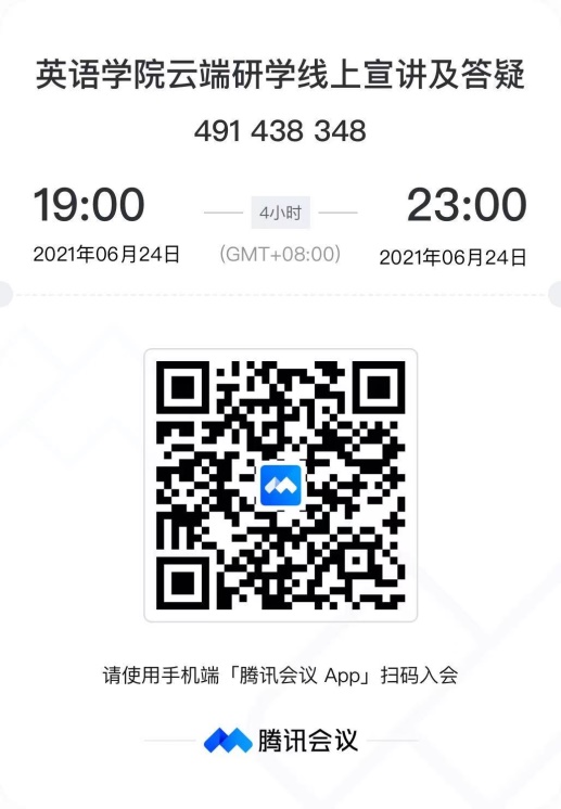 为方便各位同学报考北外米兰milan官方网站“云端研学活动”,米兰milan官方网站将在6月24日(本周四)晚19:00举行线上宣讲和答疑活动,腾讯会议号为491 438 348,没有密码,二维码如下所示。欢迎广大同学参加!
