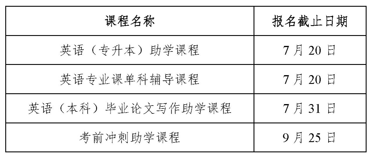英语(专升本)助学课程、英语专业课单科助学课程、英语(本科)毕业论文写作助学课程、考前冲刺助学课程。